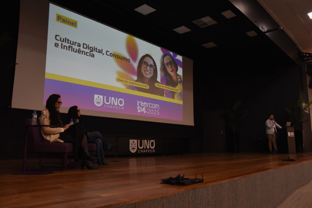 Na manhã de sexta-feira (04), aconteceu no Salão Nobre da Unochapecó o painel “Cultura Digital, Consumo e Influência”, com as doutoras Ali Machado e Issaaf Karhawi, promovido no Intercom Sul 2025.